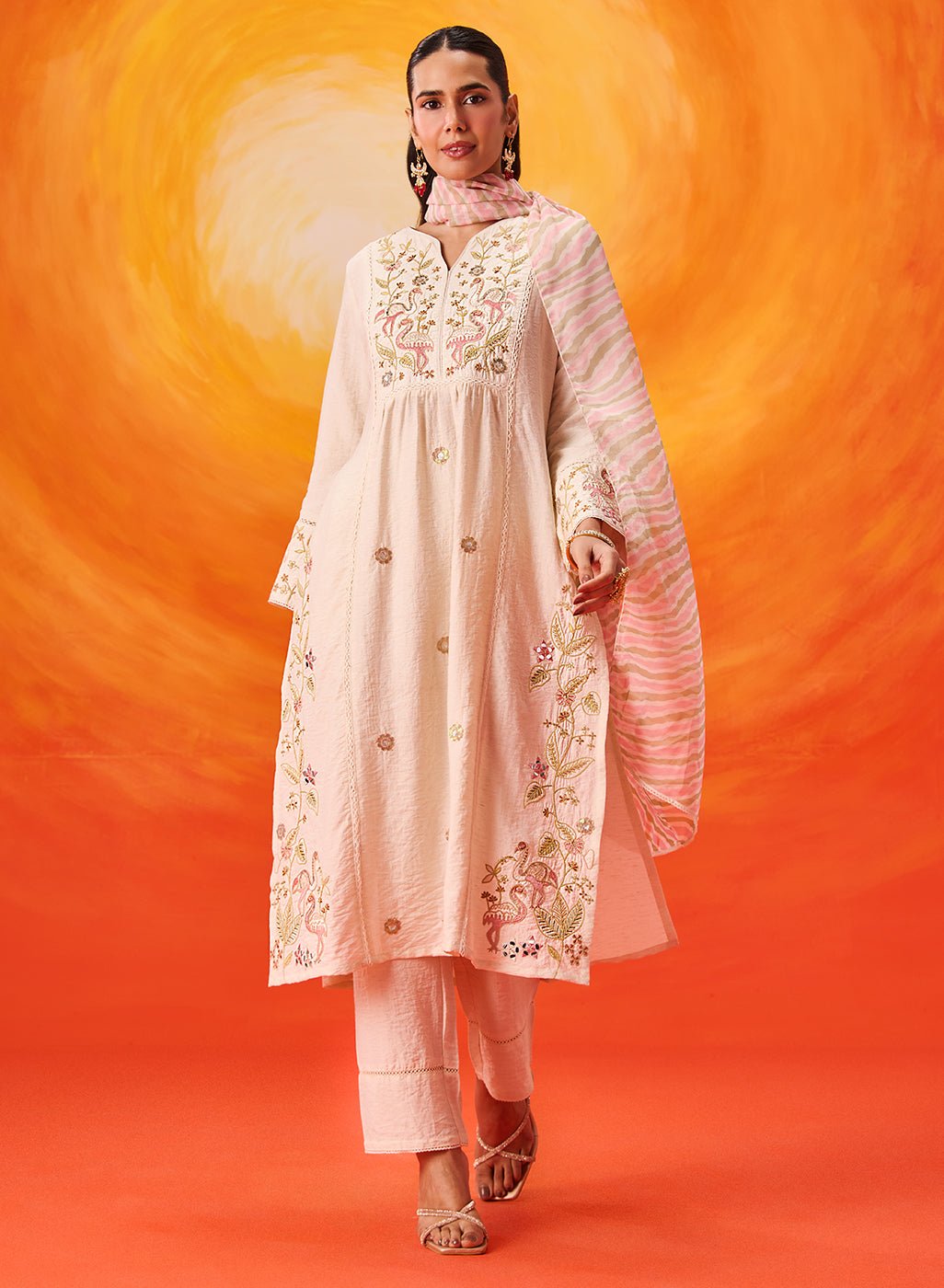 Elegant and understated, this ivory suit set combines delicate detailing with a refreshing, soft palette. Crafted from breathable linen, it is enhanced with intricate dori and resham embroidery featuring playful flamingo and floral motifs, subtly highlighted with sequins and mirror accents.