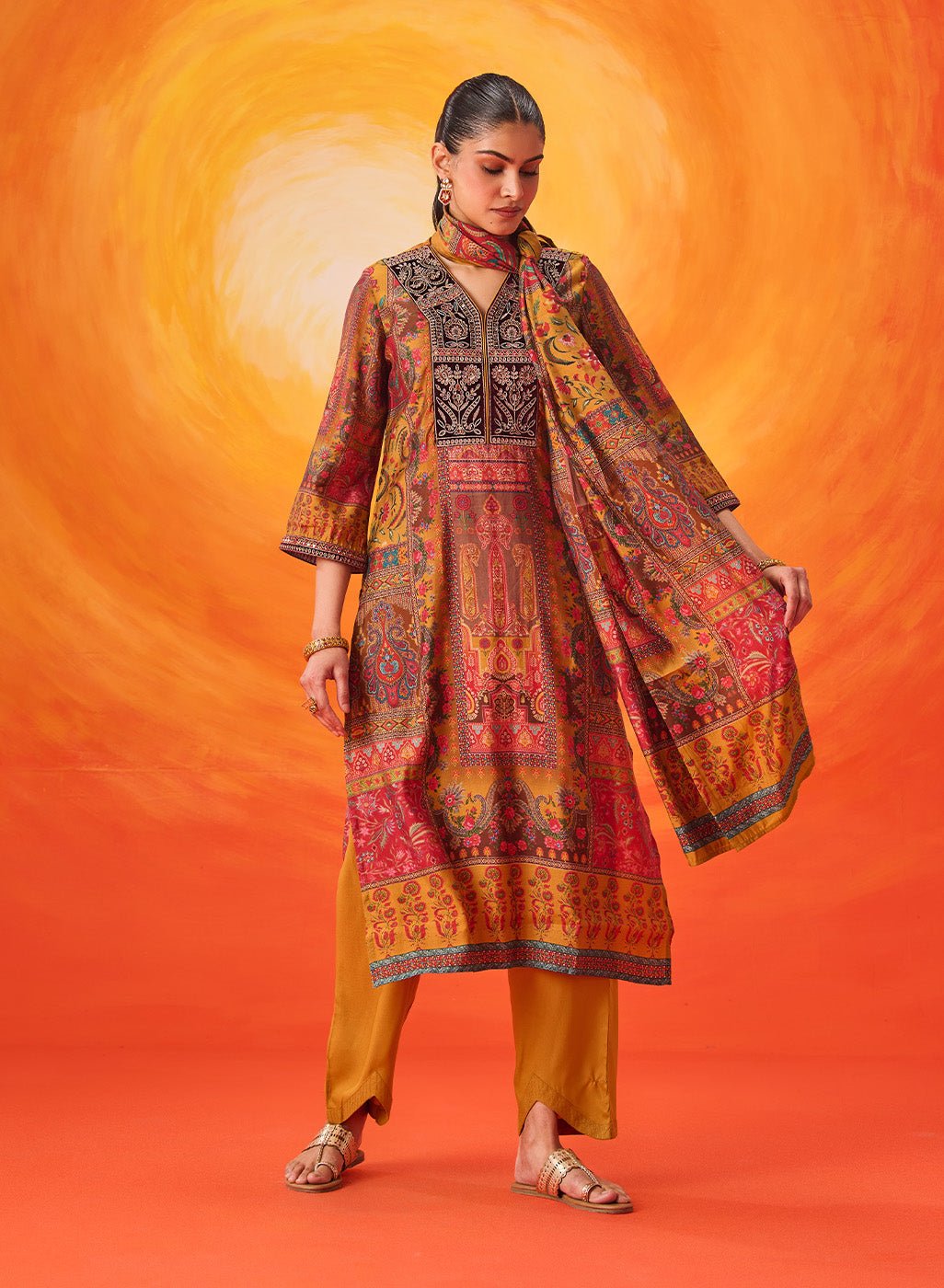 This mustard kurta set feels like a quiet ode to craft—rich in colour, layered in detail, and timeless in spirit. The all-over print forms a beautiful canvas for intricate dori embroidery, while velvet accents and soft shimmer add depth without excess.