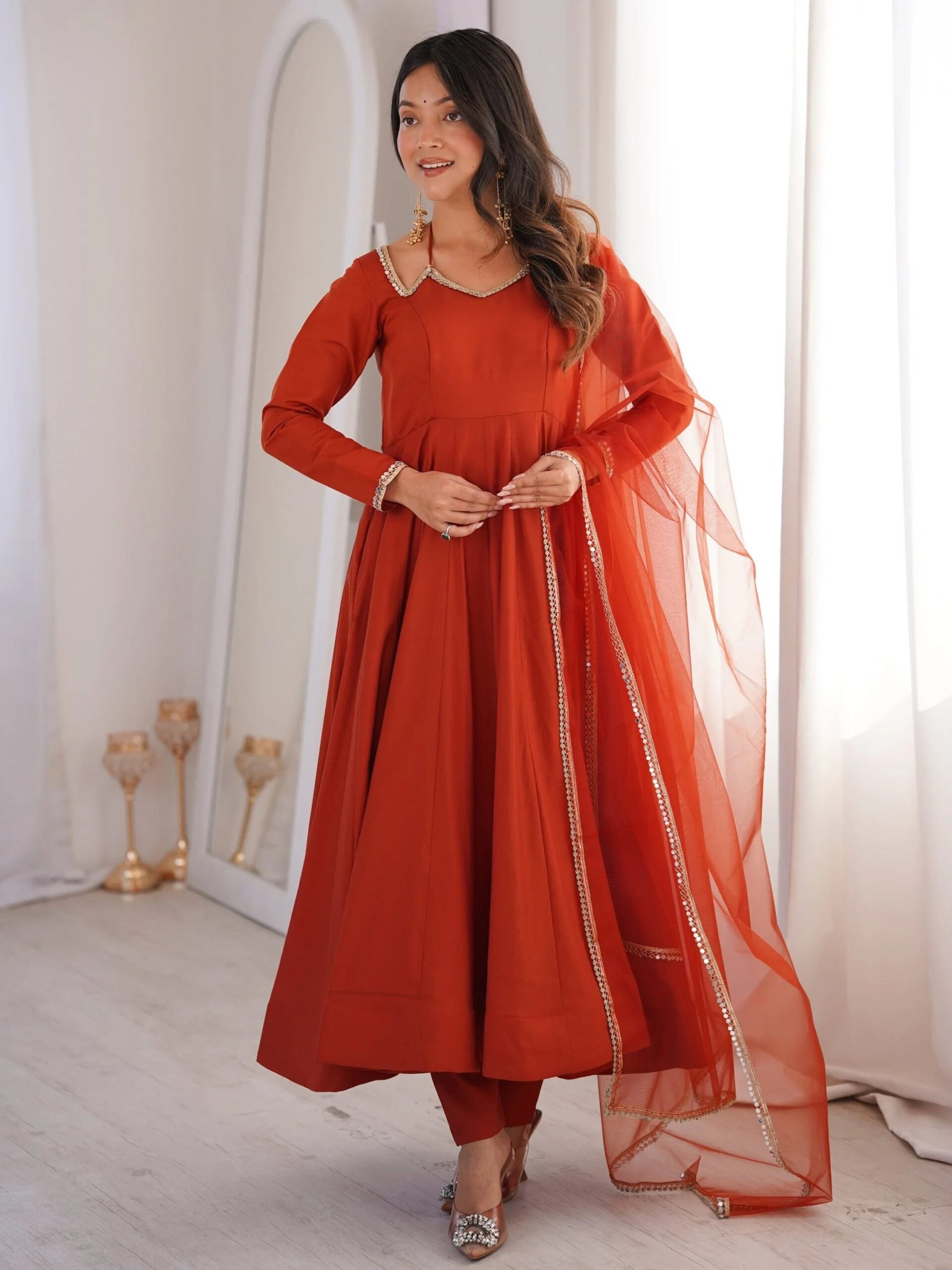 Featuring a rich burnt orange Anarkali set, the outfit highlights a warm rusty orange shade with subtle gold lace detailing that enhances the elegant look.