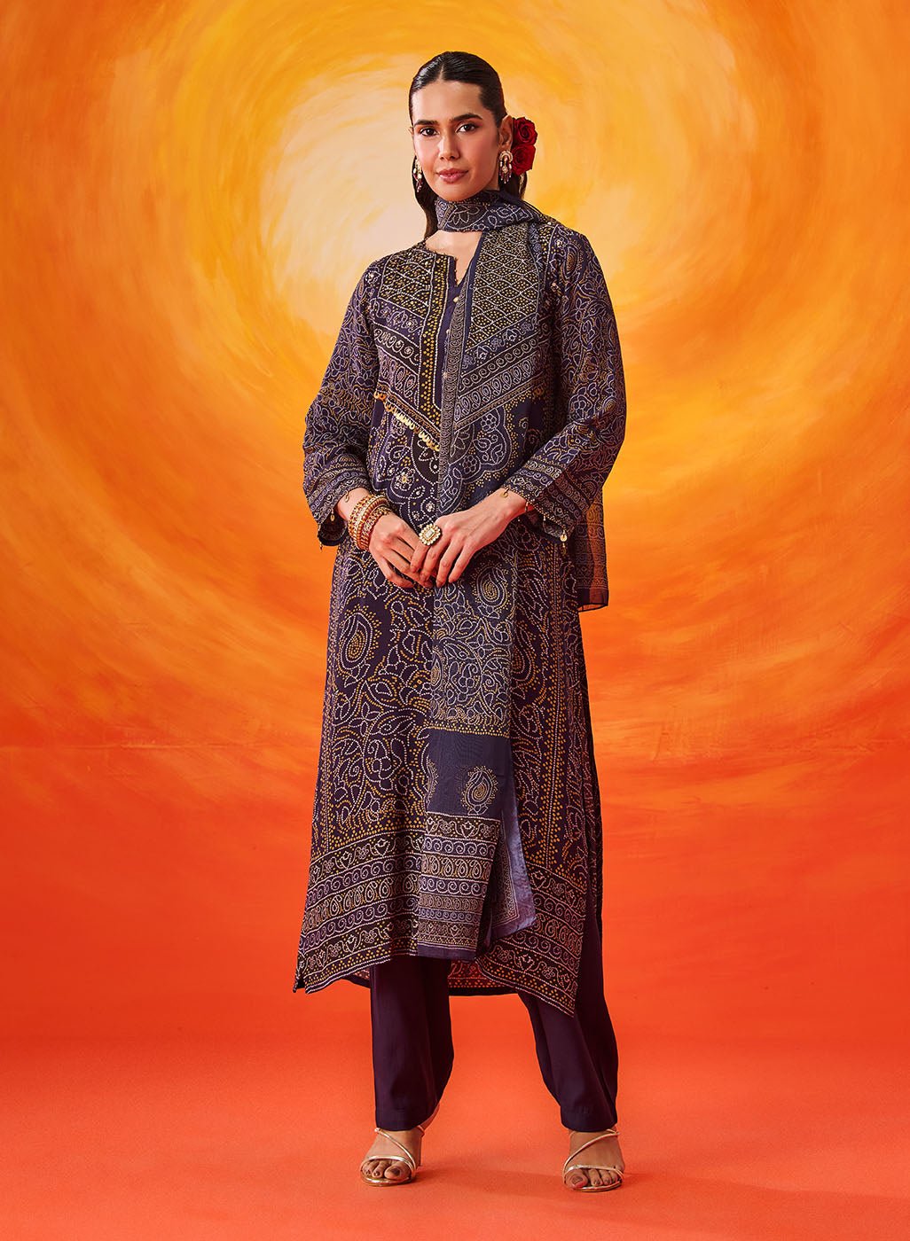 Rich yet effortless, this blue printed suit set brings a festive flair without going over the top. The Bandhani-inspired print adds traditional charm, while delicate bead and sequin work along the neckline and sleeves lends a soft shimmer—perfect for celebrations that call for comfort and elegance.
