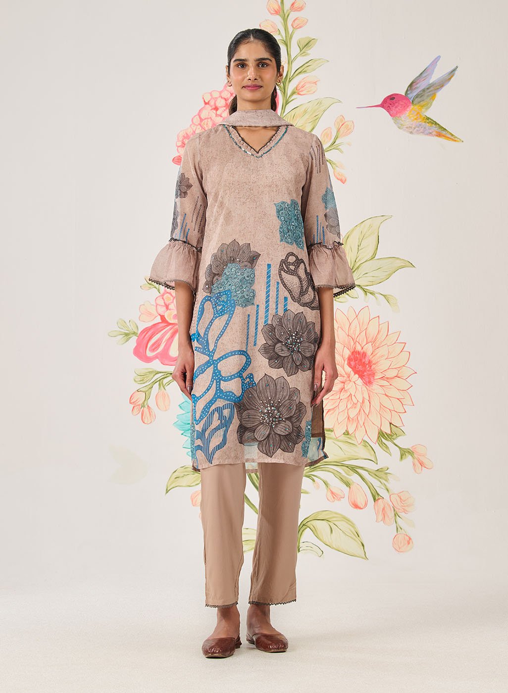 Soft, airy and easy to wear, this beige organza suit set stands out with bold floral prints and delicate finishing. Frilled details, soft shimmer and lace accents keep it polished without feeling heavy.
