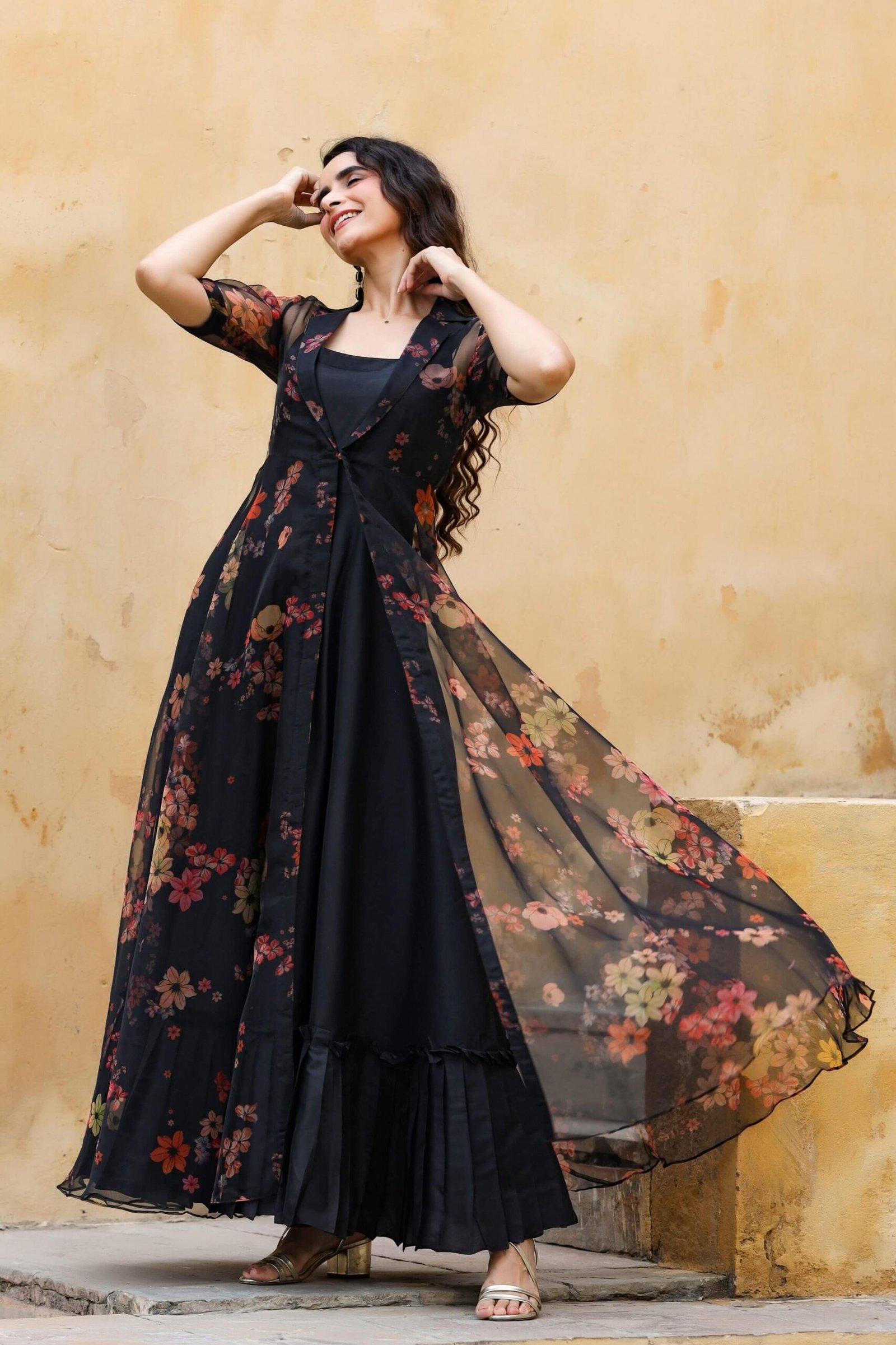 Be the showstopper of the night with the Rich Stylo Dazzle Black Evening Dress. Featuring a front open jacket with a Notched Collar and elbow-length sleeves, this dress is perfect for any special occasion. The jacket is made of organza and the inner is made of Santoon Silk, with a cotton lining for extra comfort. The dress features a classic silhouette and sophisticated details, so you can get the best of the black evening dresses.