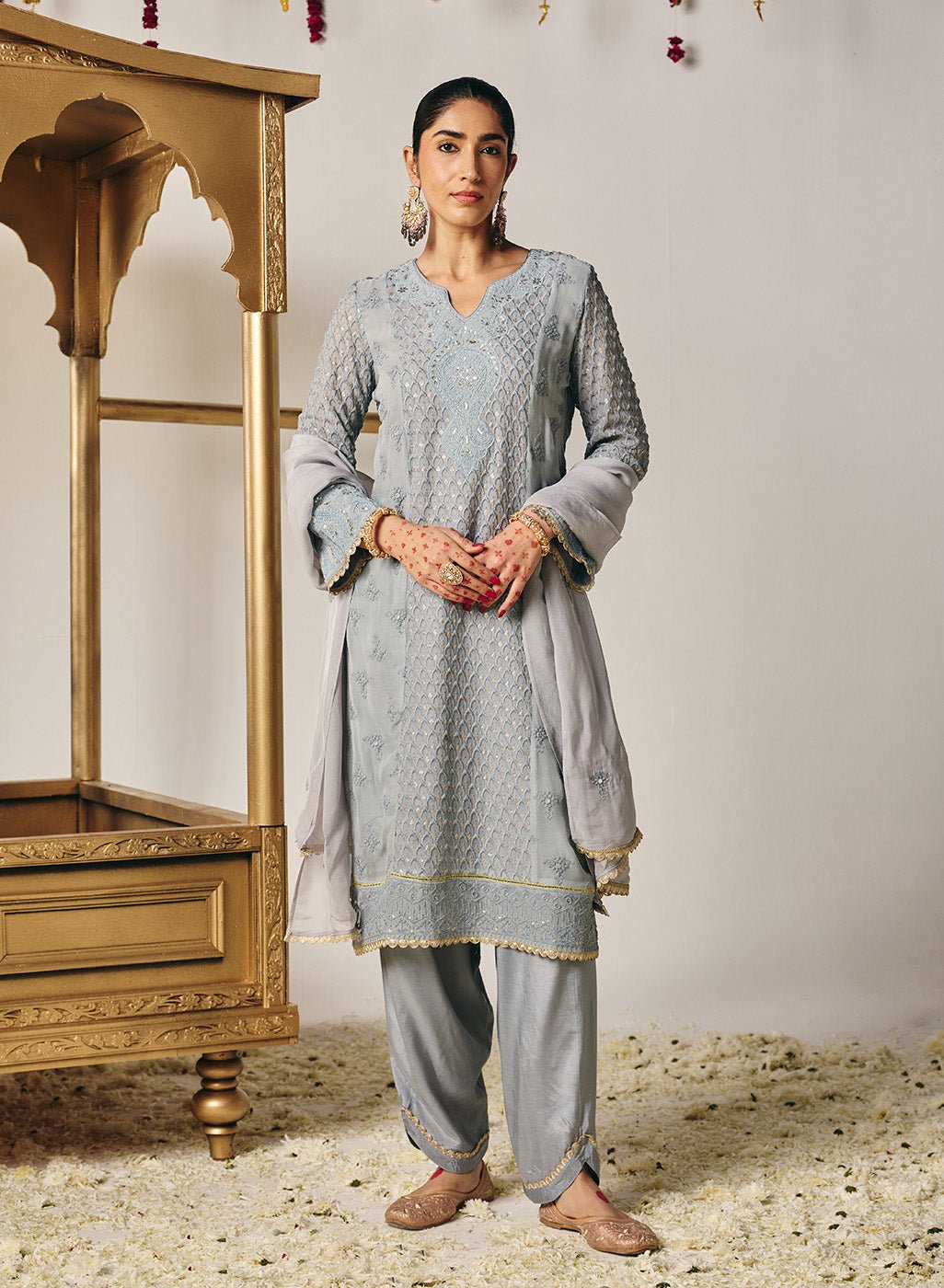 – Lightweight solid organza dupatta with scalloped lace edging