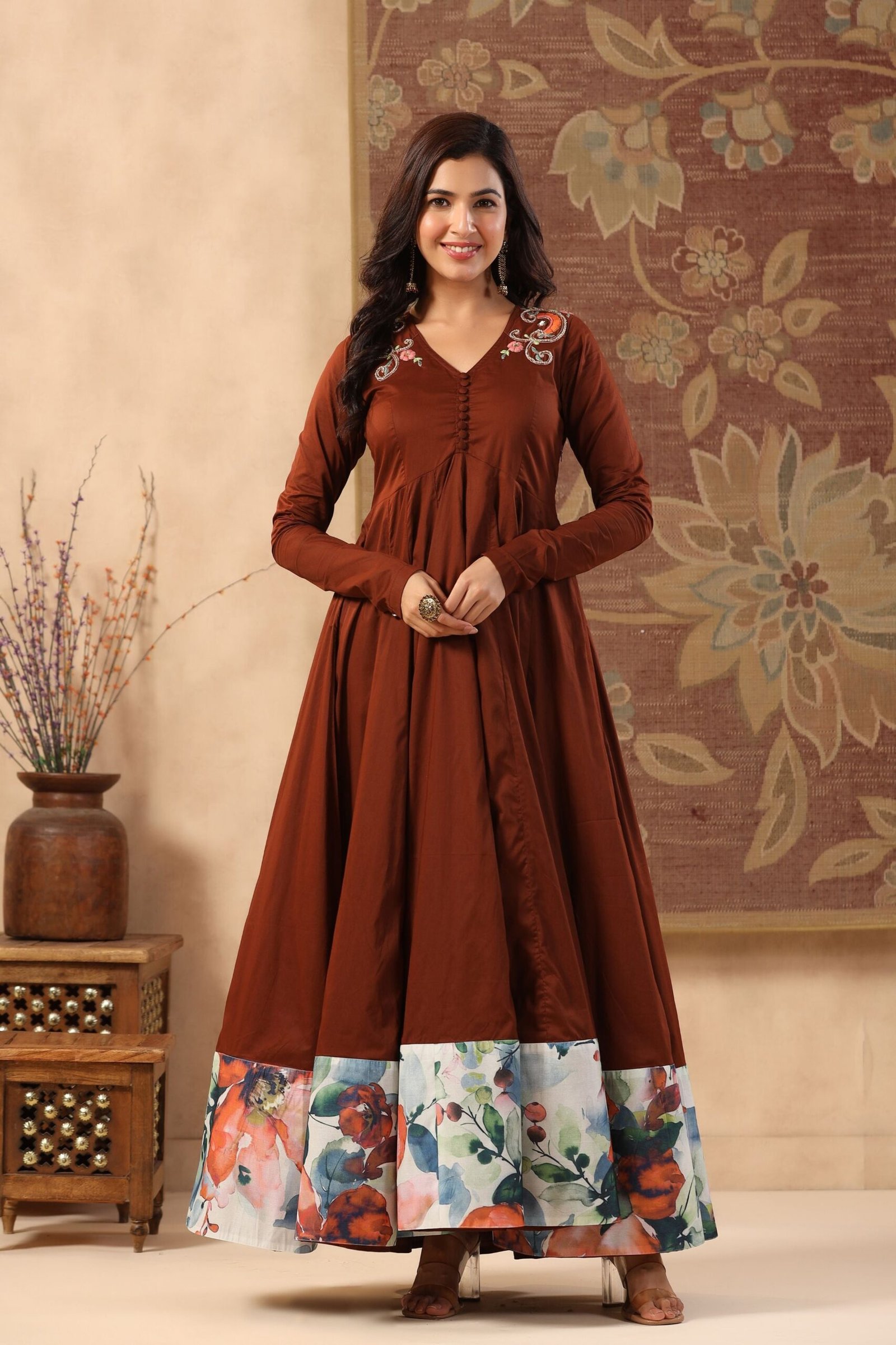 Export quality cotton kalidaar dress with digitally printed Chanderi border on hemline. Yoke embellished with elegant hand embroidery and fabric buttons.