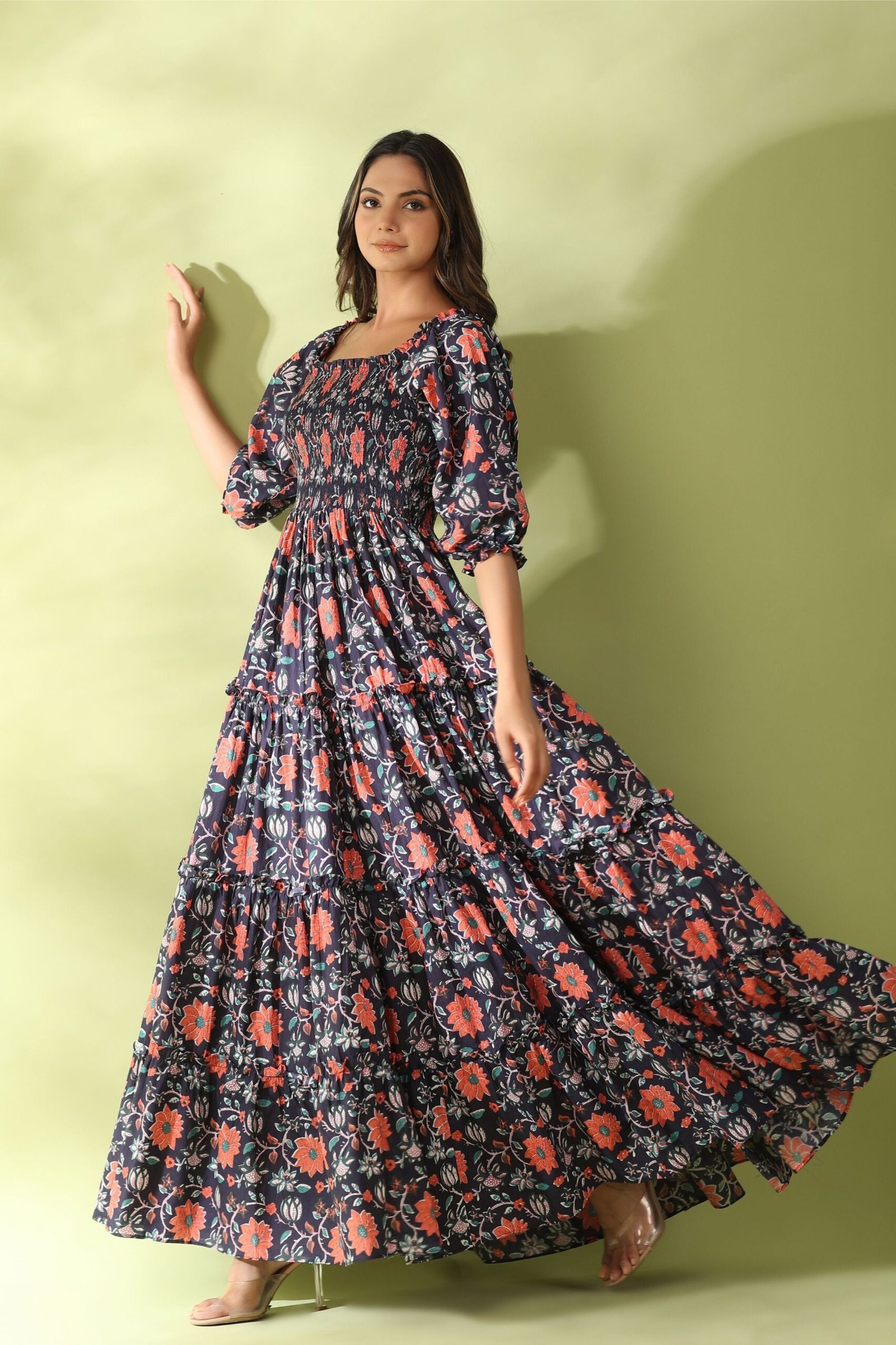 Add this stunning long floral tiered dress to your wardrobe for both comfort and style. This beautifully crafted dress is made with pure cotton fabrics, ensuring all-day comfort that you’ll love. With its floor-length tiered design, this dress exudes a graceful and feminine charm. The pure cotton fabric is not only soft against the skin but also provides a breathable feel, making it perfect for any occasion. The square neck adds a touch of elegance, while the elasticated front and back ensure a perfect fit every time. The dress also features lots of flare, giving you the freedom to twirl and move with grace.
