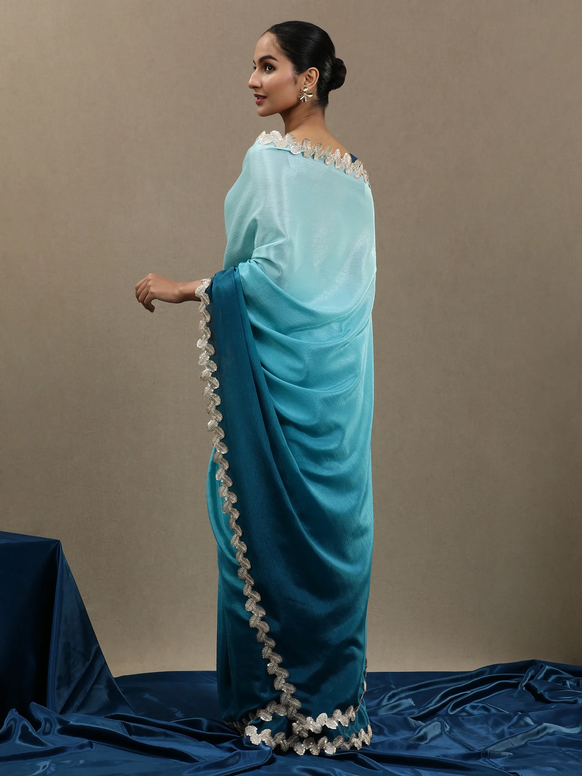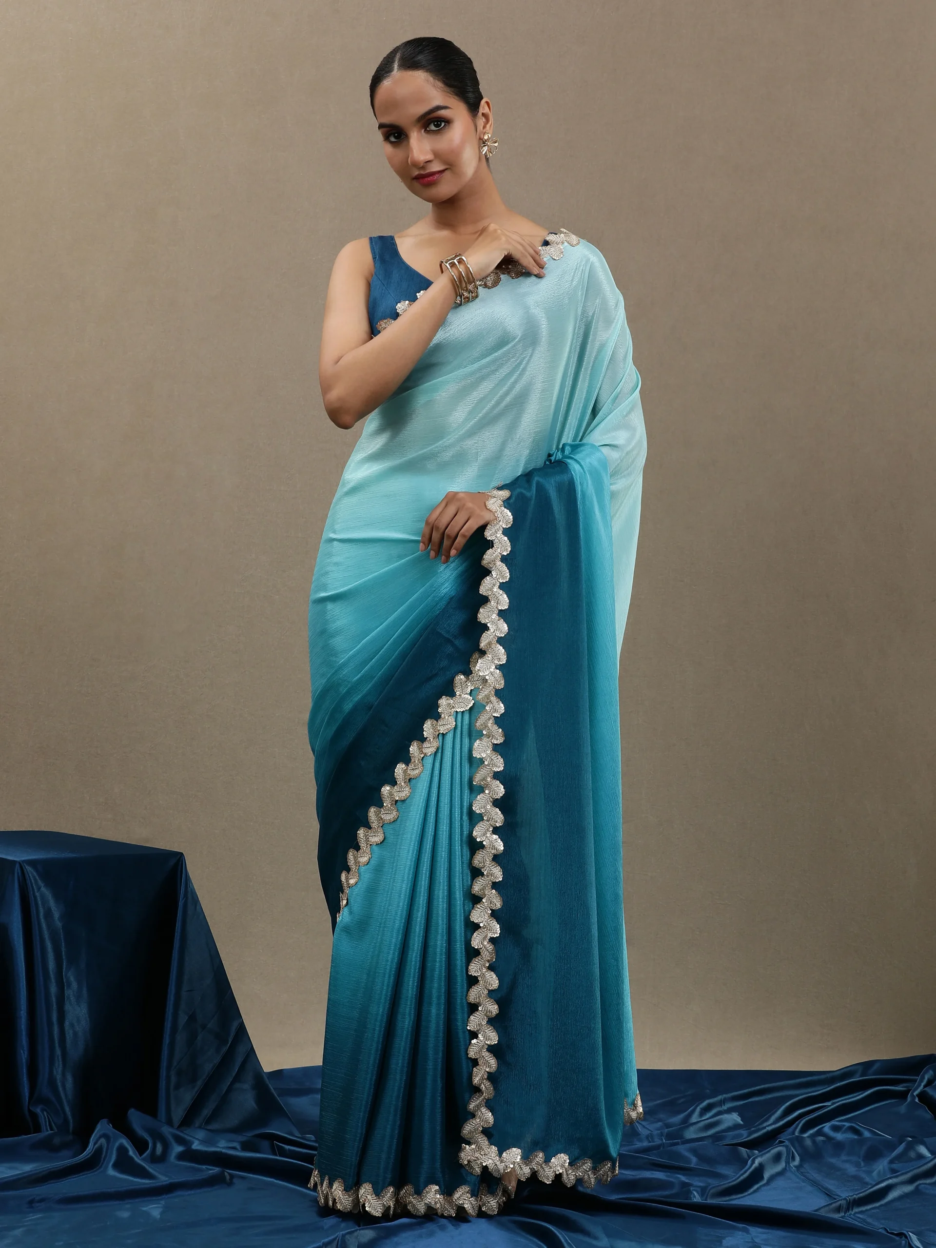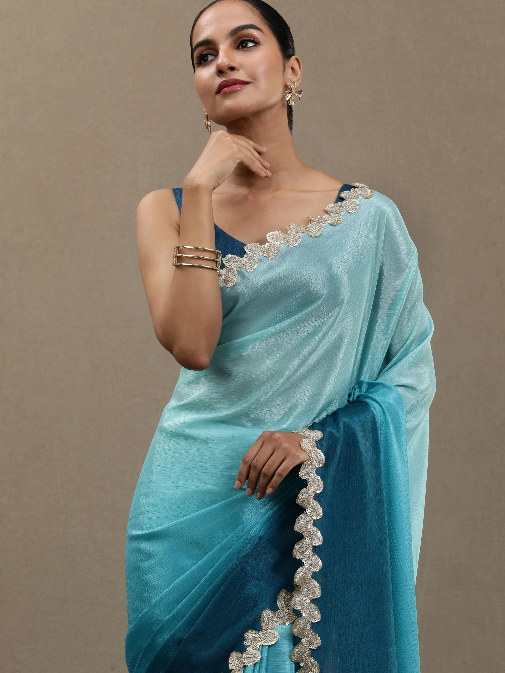 Enhanced with a subtle foil finish, this Blue Georgette Saree reflects a delicate shimmer that adds a modern festive touch. The intricate moti embroidery further elevates its beauty, creating a perfect balance between traditional detailing and contemporary glamour. Each embellishment is thoughtfully placed to add texture and sophistication without overpowering the design.