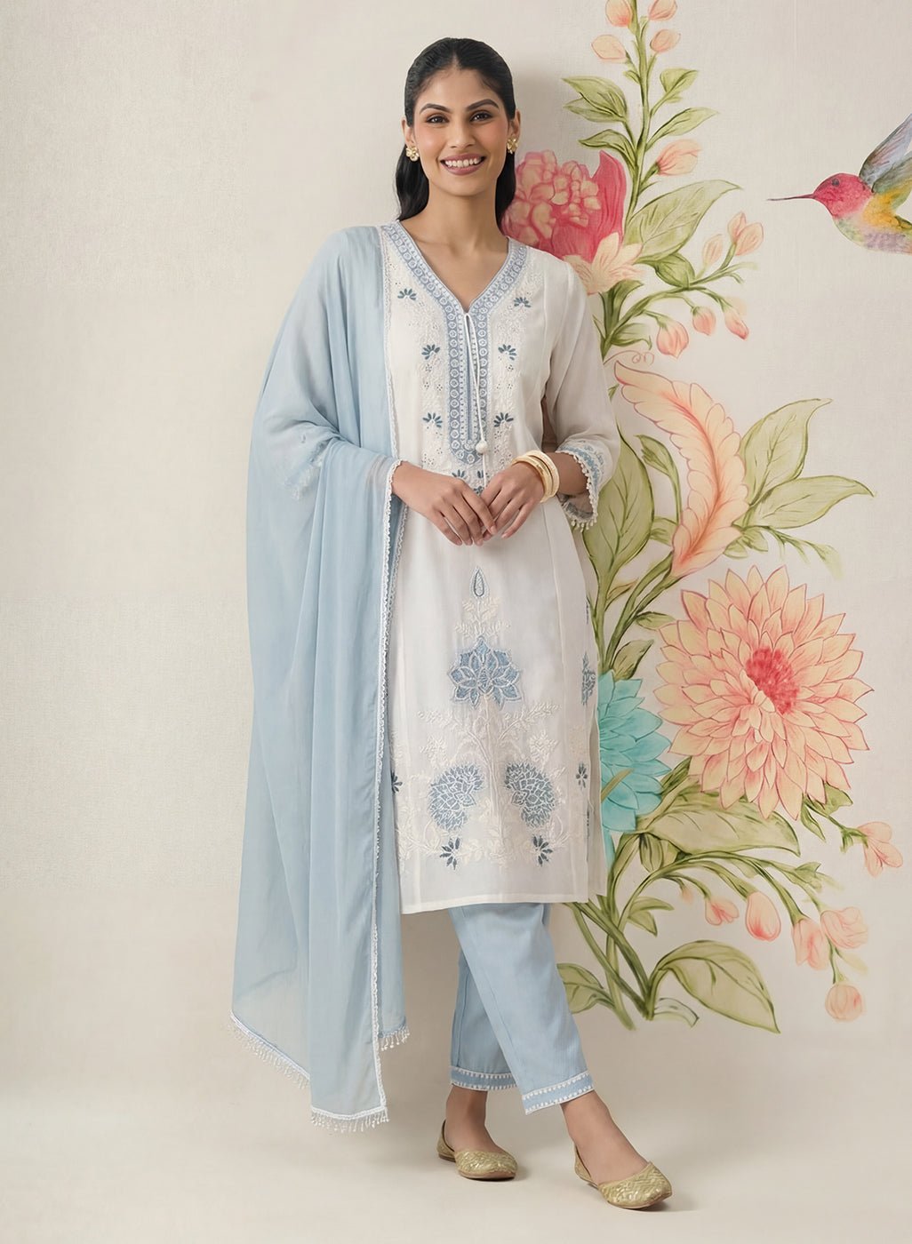 Fresh and serene, this light blue suit set embodies calming elegance, making it perfect for both daytime gatherings and intimate occasions. Crafted from lightweight georgette with a soft sheen, it features delicate dori embroidery accented with pearl and rhinestone highlights across the front, neckline, and sleeves.