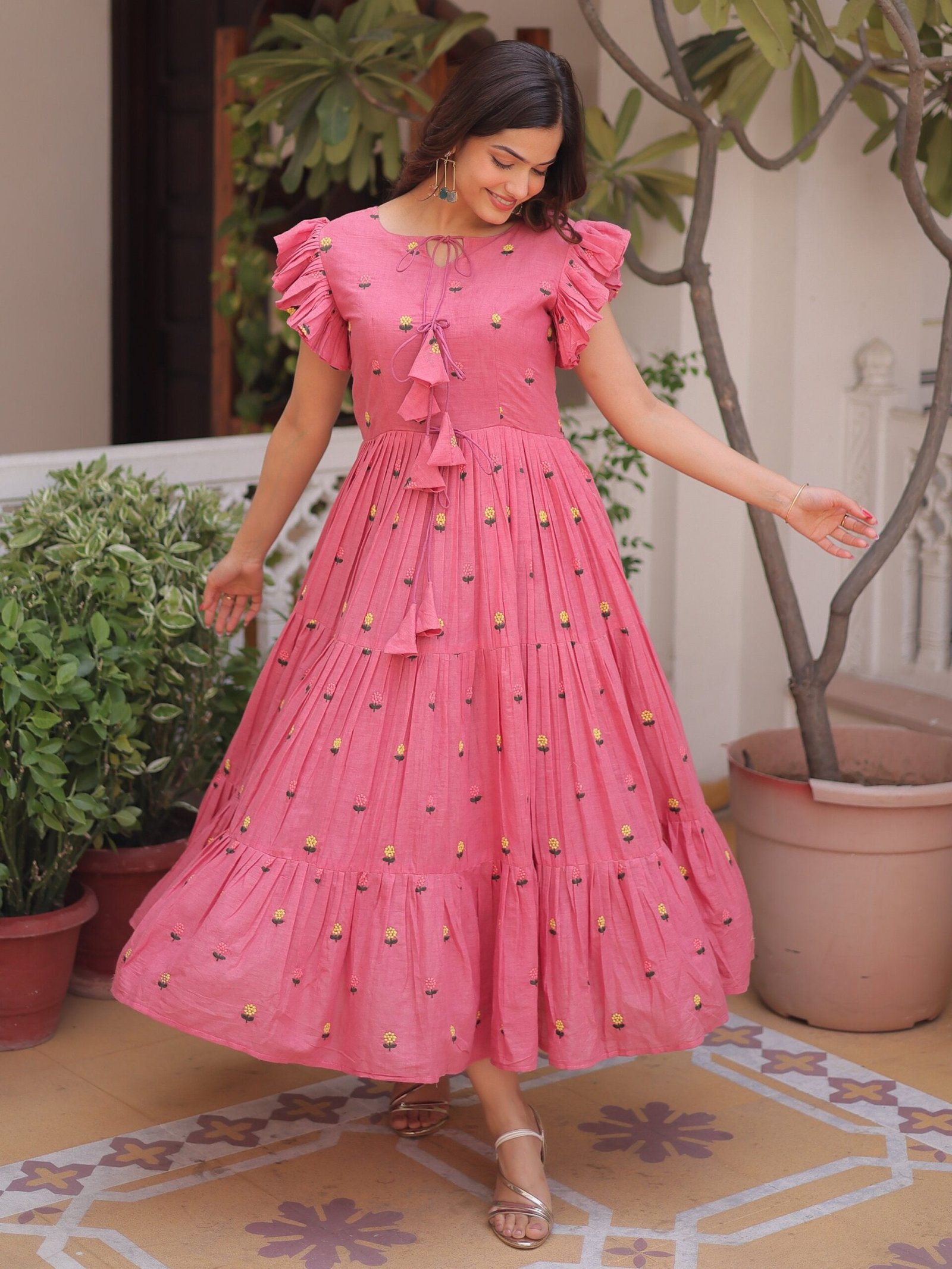 The lower flare continues in the same rose pink tone with evenly spread floral embroidery. The tiny yellow and green motifs add a lively yet subtle contrast.