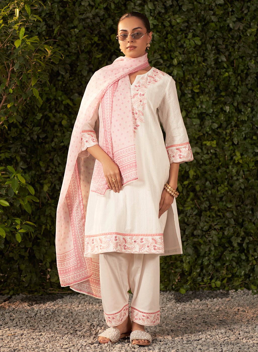 This Rose Suit Set with Dupatta?for women captures the essence of evening wear with a soft, feminine charm. Crafted from breathable cotton jacquard with delicate dobby detailing, the straight-fit kurta features intricate thread embroidery adorned with sequin and mirror work.