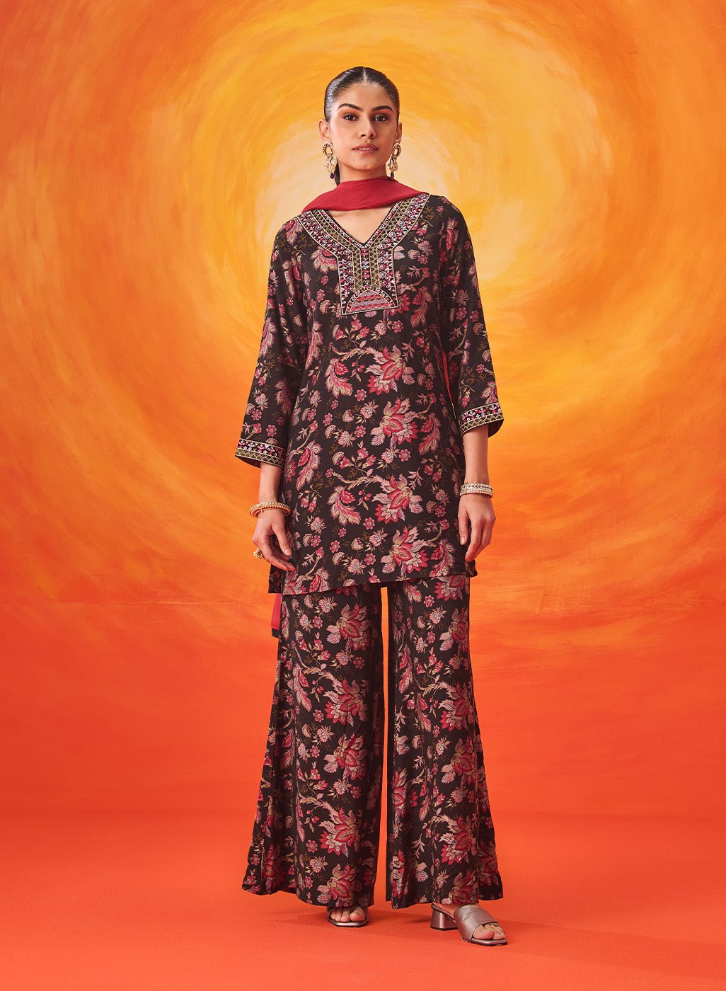 Set against a deep black canvas, the bold floral prints and embellished embroidery come together to create a look that feels timeless yet fresh. Subtle shimmer along the neckline adds just enough highlight, making this suit set ideal for both daytime gatherings and evening occasions.