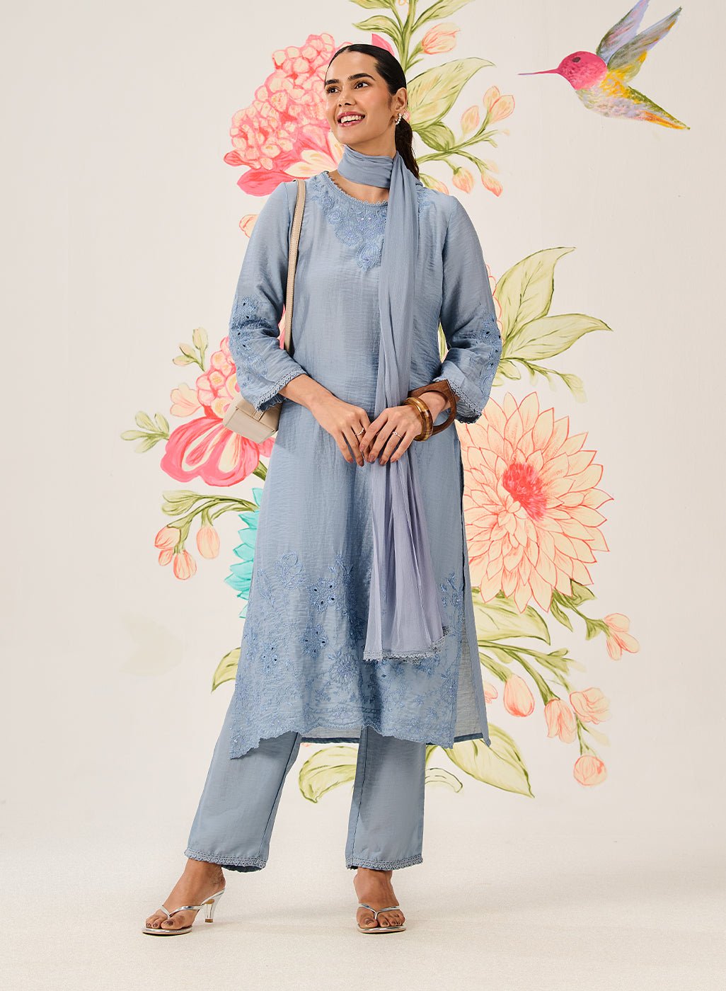 Schiffli detailing on the sleeves and kurta hemline for added texture and elegance.