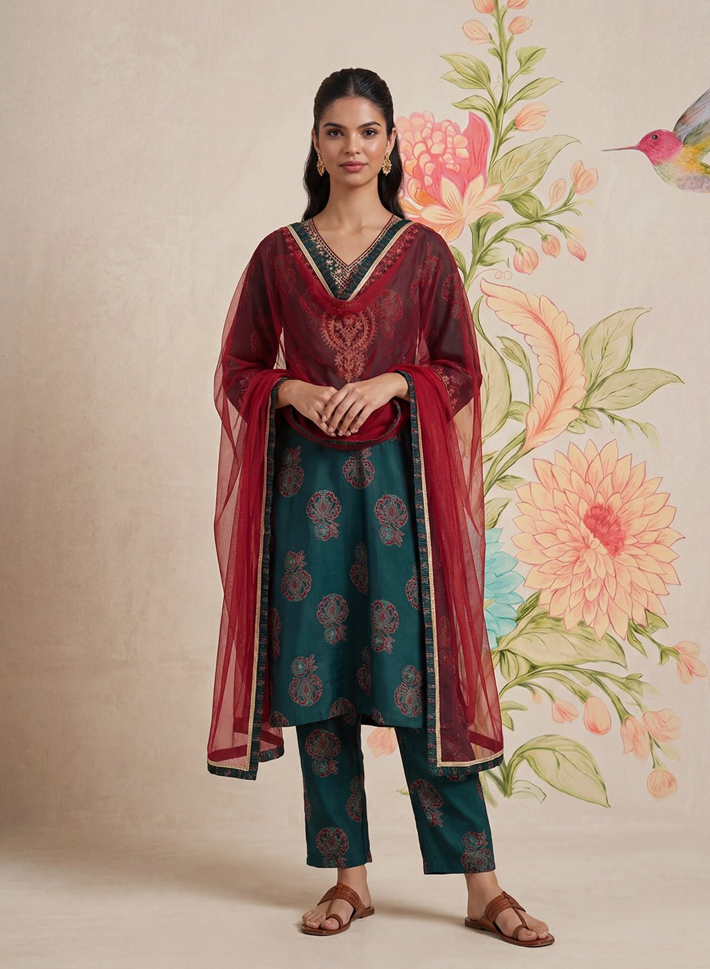 Fresh yet regal, this teal suit set blends traditional block print-inspired motifs with contemporary ease. Intricate dori and resham embroidery on the V-neckline, sleeves, and side slits is elevated with zari and sequin highlights, adding a subtle festive shimmer. The straight-cut silhouette ensures all-day comfort while maintaining a polished, elegant look. Paired with printed straight pants and a contrasting solid organza dupatta with pleated printed borders, this set transitions effortlessly from day to evening occasions. Crafted from a soft, lightweight cotton blend fabric. Features all-over block print-inspired motifs. Dori and resham embroidery enhanced with zari and sequin highlights. V-neckline with detailed placement embroidery. Long straight kurta with embroidered sleeves and side slits. Printed straight pants with an elastic waistband and functional pockets. Comes with a contrasting solid maroon organza dupatta with printed pleated edging.