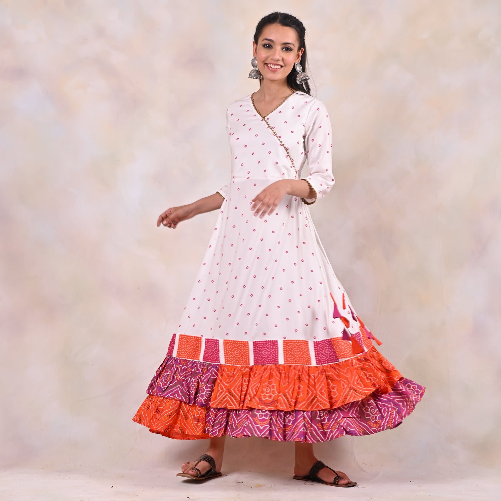 This bandhani dress with angrakha yoke is just perfect! Featuring gota and tassel detailing and tiered hemline.